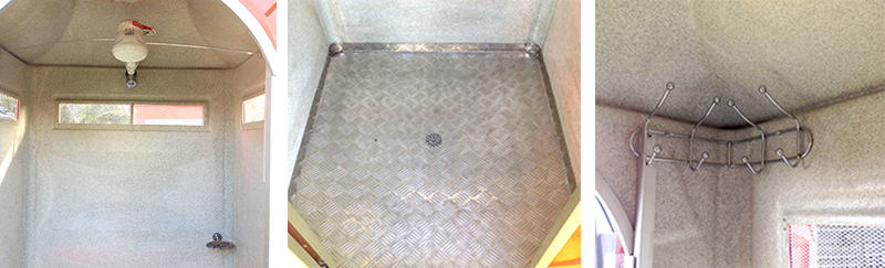 Puerta: Del mismo material de la caseta, incluye herrajes de aluminio en marco exterior e interior, ancho puerta 0.60 mts, alto de puerta 1.93 mts. con picaporte manual que indica Ocupado-Disponible, y 3 ventanas de ventilación con malleras, techo con tragaluz de polietileno natural.